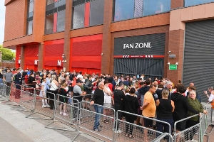 沉重️安菲尔德场外摆放成百上千条围巾,数百人排队签名吊唁
